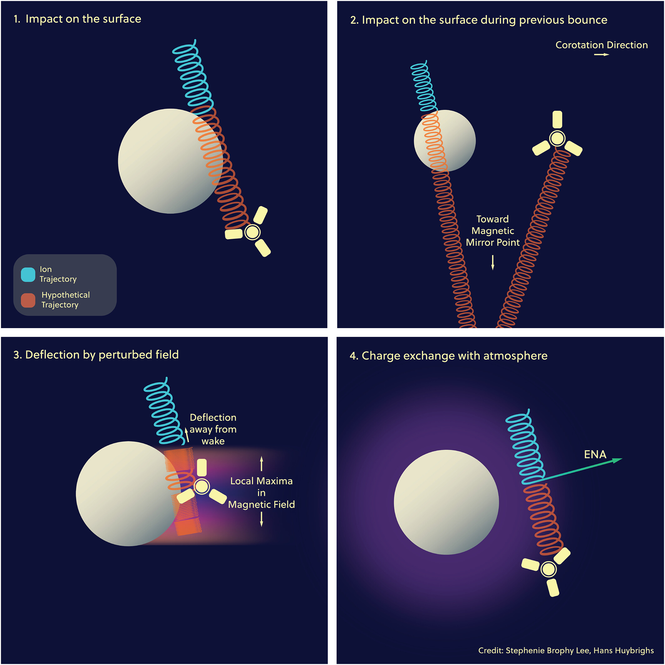 The Juno measurements show what happens with the energetic protons at 350 km above the surface, in Europa’s wake (considering the general sense of motion of the protons). There, protons have disappeared, compared to further away where they are abundant. The cartoon below shows some classical ideas about what happens to the protons near Europa (panel 1-2).