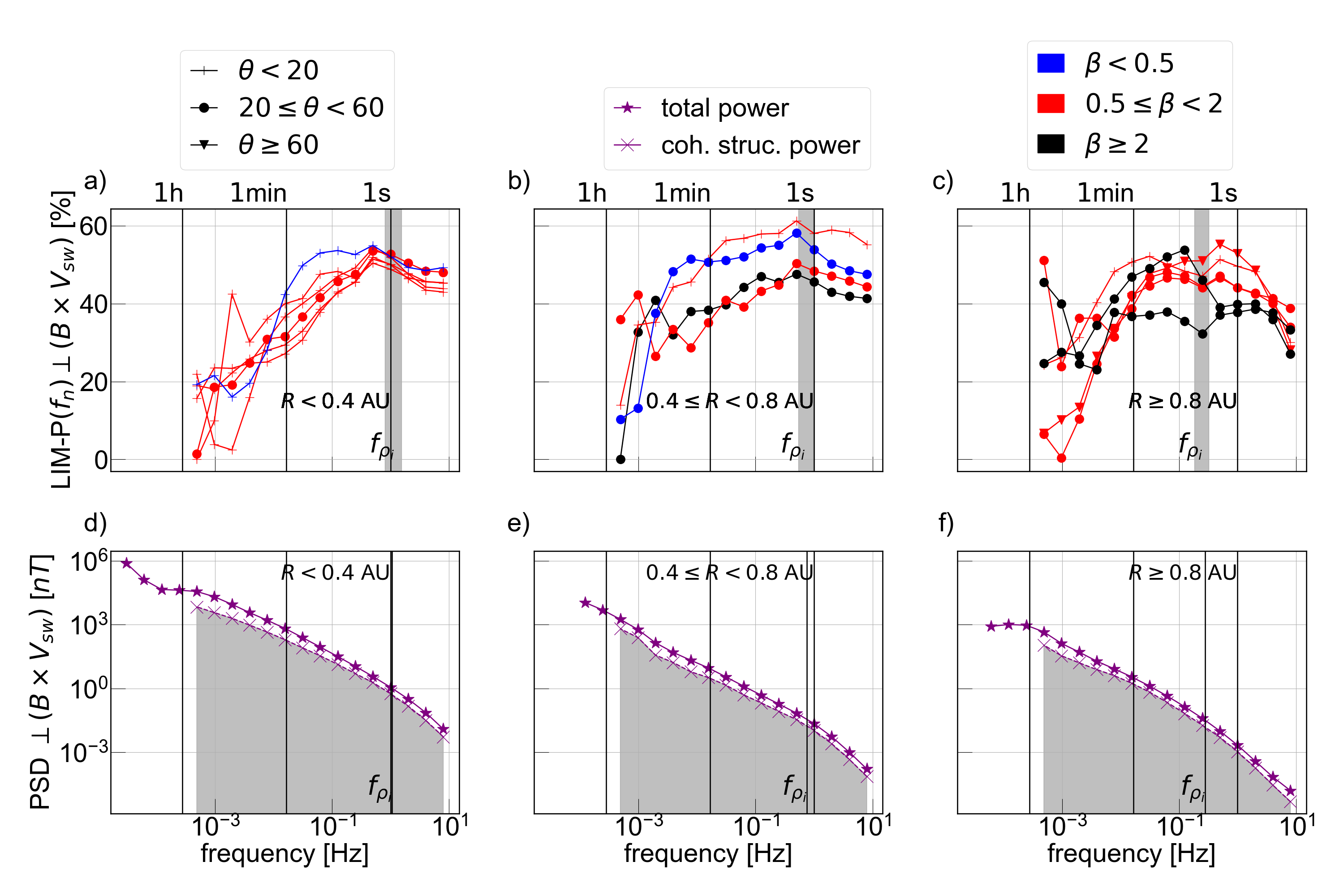 Power in coherent structures as a function of frequency. Results are plotted for the magnetic field component B⟂(BxVsw). Left to right, the panels group the intervals by heliocentric distance: panels (a), (d) R < 0.4 au; panels (b), (e) 0.4 ≤ R < 0.8 au; and panels (c), (f) R ≥ 0.8 au. Upper panels plot the percentage of power in coherent structures LIM-P(fn) and lower panels overplot the power spectral density of coherent structures (purple ×, grey shading) on the total power (purple ⋆) for one of these intervals. On all panels, black vertical lines denote the 1 hr, 1 minute, and 1 s timescales. On upper panels, the vertical grey shading indicates the range of frequencies of the ion-gyro radius of all intervals. The of the single interval shown in the lower panels is indicated by a black vertical line. For the different intervals in the upper panels, the colours denote plasma beta, β < 0.5 (blue), 0.5 ≤ β < 2 (red), and β≥2 (black). Field-alignment angle value (range 0°–90° obtained by folding in angles ≥90°): θ < 20° (+), 20°–60° (∘), and θ ≥ 60° (△).