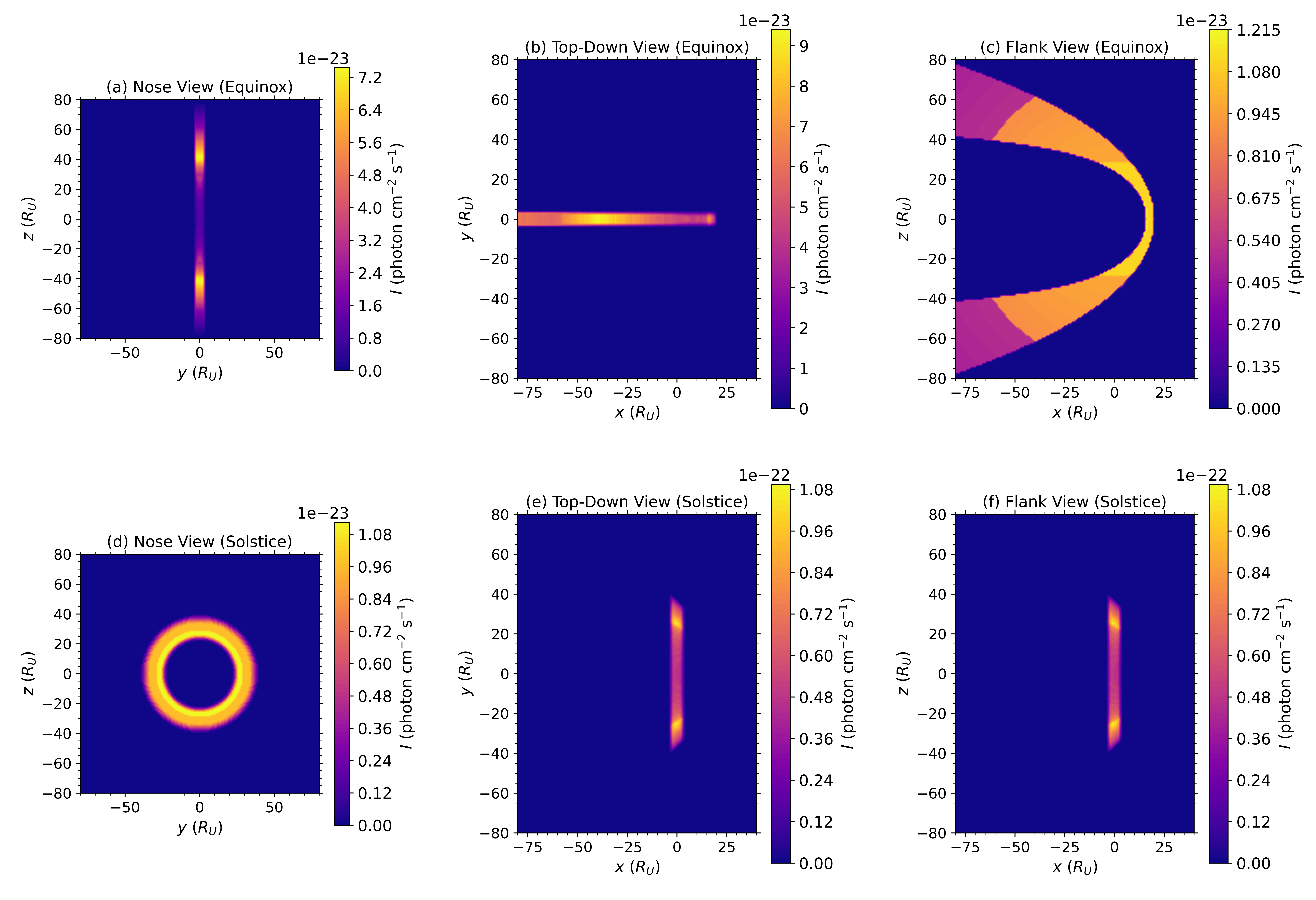 Modelled intensity maps for a SMILE‐like SXI at 212 R_U from different viewing geometries at (top row) equinox, where the neutrals are edge-on to the Sun, and (bottom row) solstice, where the neutrals are ring on to the Sun: (a/d) front‐on, (b/e) top‐down and (c/f) side‐on. The different panels show that the amount of flux detected is dependent on viewing position, and an orbital mission should consider the implications of different possible imaging positions.