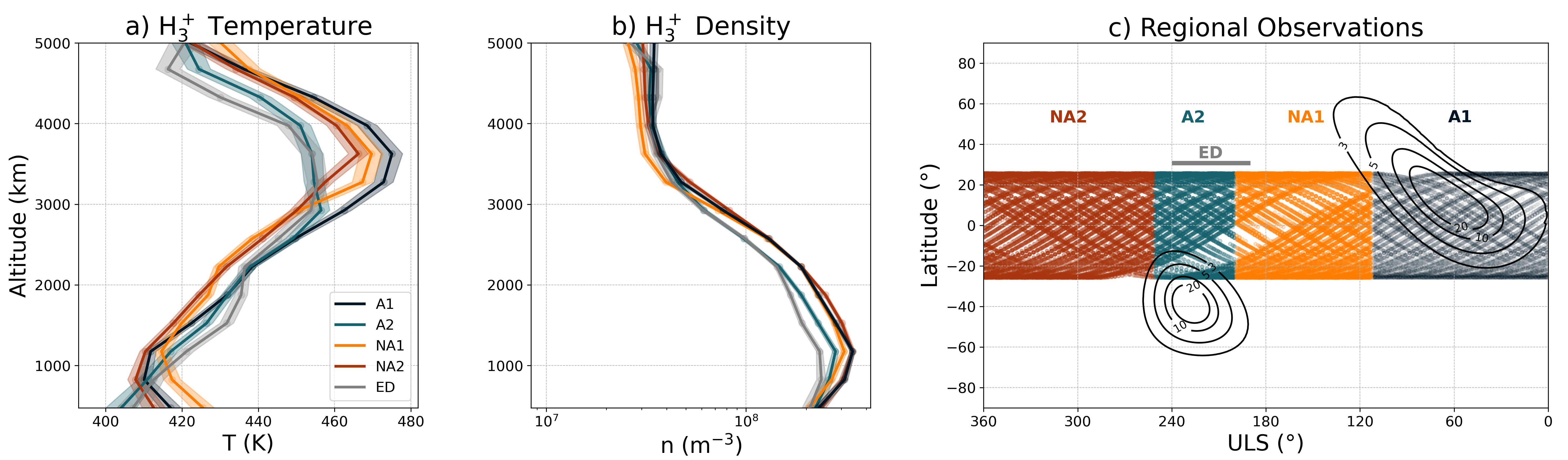 Fig 1: Vertical profiles in different regions as observed by JWST on 2025-01-19. a) and b) H3+ temperature and number density, respectively, for auroral region 1 (A1, 0° - 112°W, dark grey), auroral region 2 (A2, 200° - 251°W, dark green), non auroral region 1 (NA1, 113° - 199°W, orange), non auroral region 2 (NA2, 252° - 360°W, brown), emission dip region (ED, 190° - 240°W, light grey). c) Limb data points projected on disk used for the different regional profiles, as described above, with L-shells contours from the Q3 model (Connerney et al, 1987).